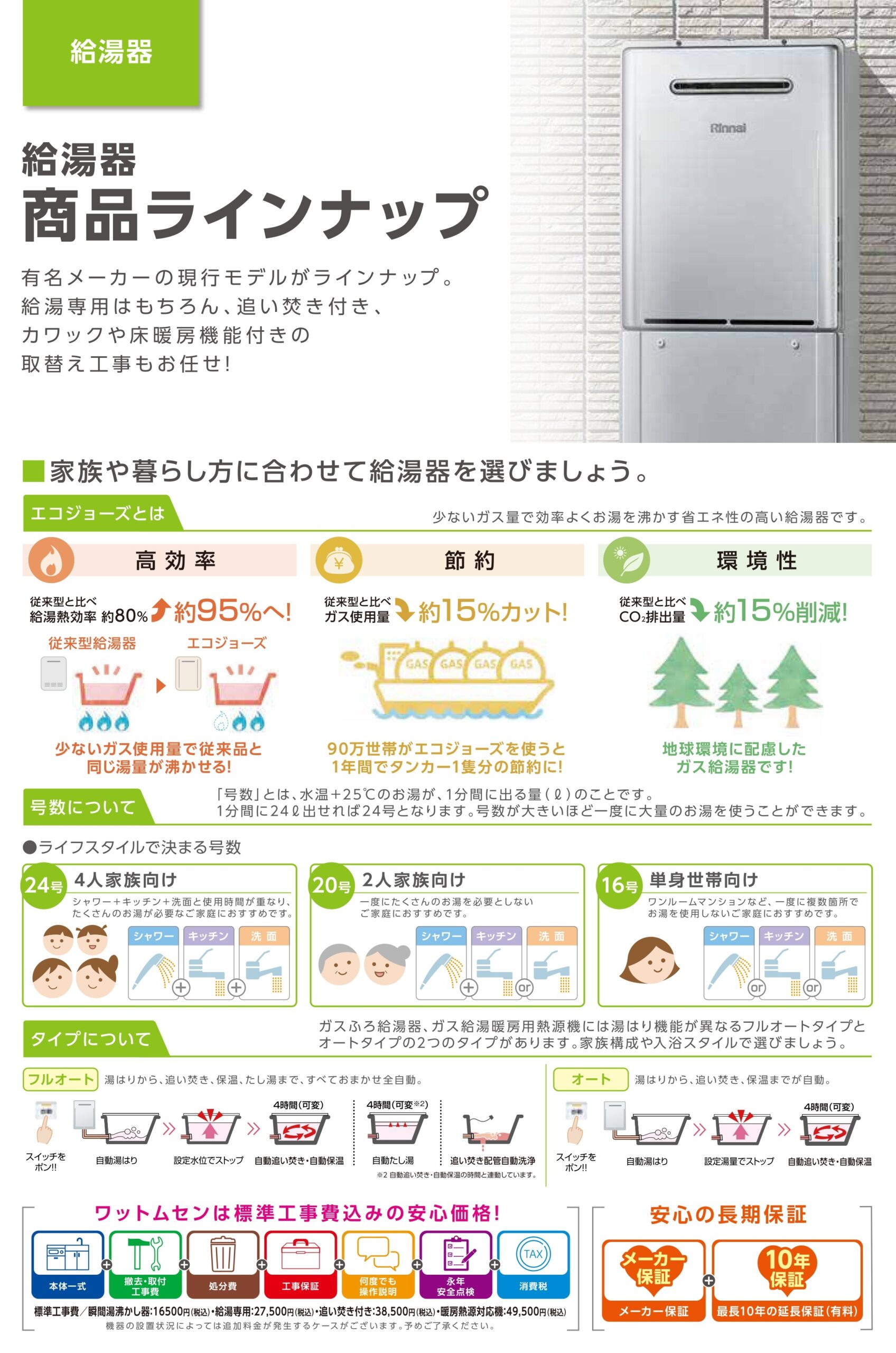 ガス給湯器の取替え・交換工事は京都市北区のワットムセンへ!リンナイ・ノーリツなど有名メーカーの現行モデルがラインナップ。給湯専用はもちろん、追いだき付き、カワックや床暖房機能付きの取替え工事もお任せ!表示価格はすべて取り付け工事費用込み!おすすめガス給湯器もありますので、お気軽にメール・電話またはお問い合わせにてにご相談ください。